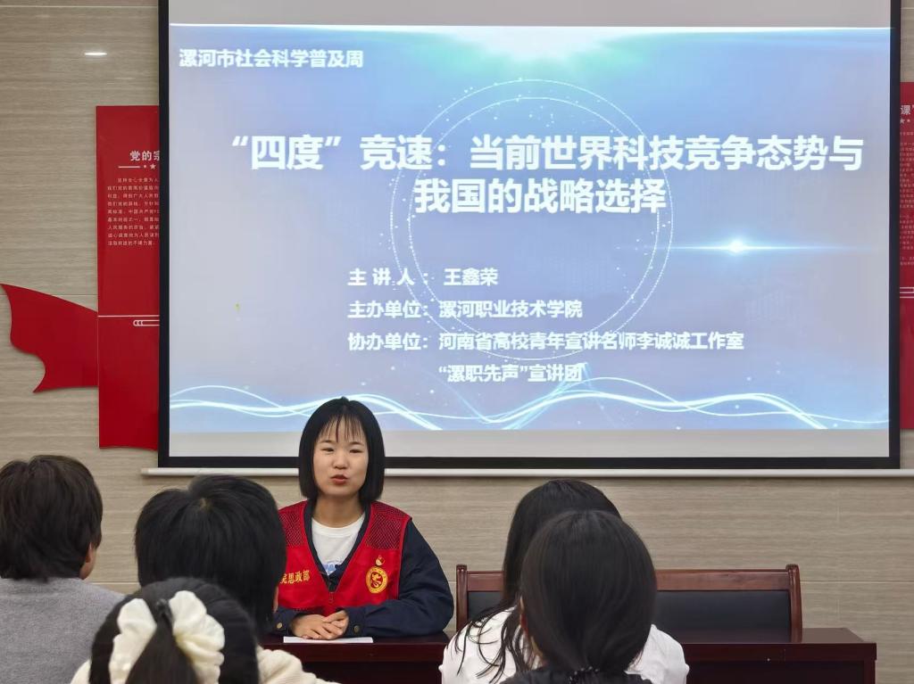 为深入贯彻落实漯河市委宣传部、漯河市社科联《2025年漯河市社会科学普及周实施方案》文件要求,进一步推动我市社会科学普及工作提质增效,9月19日下午,suncitygroup太阳集团宣讲团走进双龙社区,以《“四度”竞速:当前世界科技竞争态势与我国的战略选择》为主题开展党的创新理论宣讲活动。本次活动由suncitygroup太阳集团主办,河南省高校青年宣讲名师李诚诚工作室和“漯职先声”宣讲团协办。