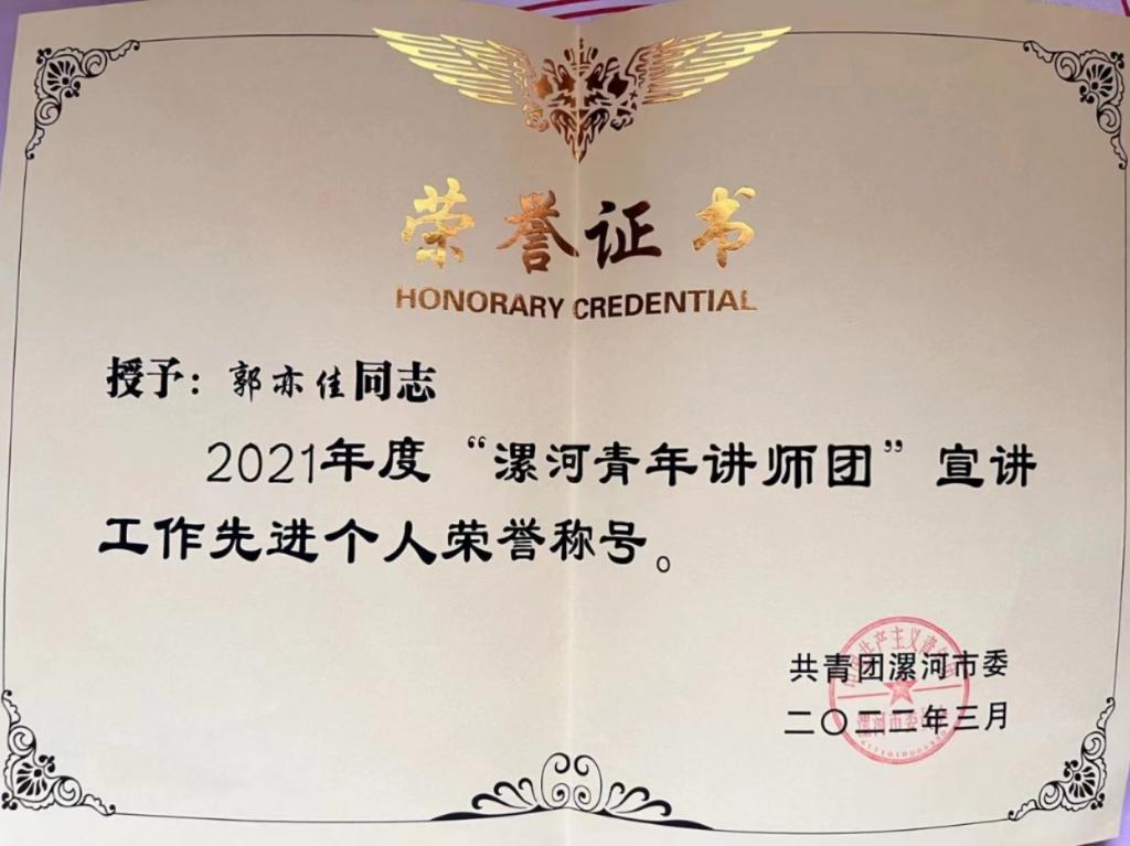 思想政治理论部李诚诚、郭亦佳老师荣获“2021年度漯河青年讲师团宣讲工作先进个人”称号。