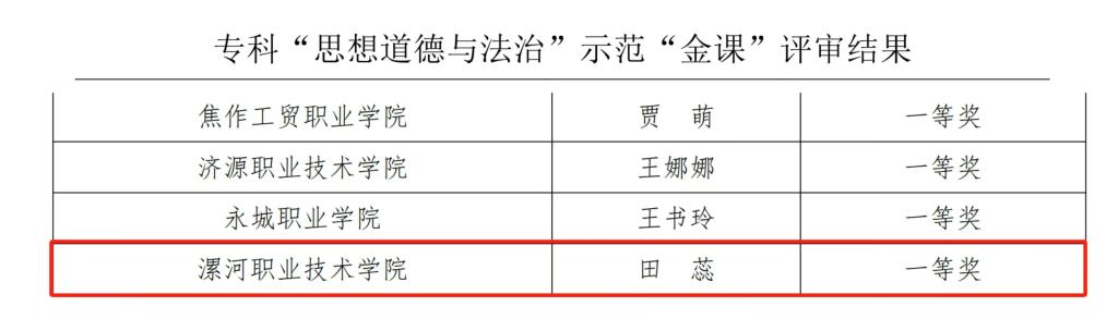 在专科组示范“金课”资源的评审中,李诚诚老师、黄莹莹老师讲授的《习近平新时代中国特色社会主义思想概论》课程专题分别荣获特等奖和二等奖,余飞老师讲授的《毛泽东思想和中国特色社会主义理论体系概论》专题荣获一等奖,田蕊老师讲授的《思想道德与法治》专题课程荣获一等奖,王鑫荣讲授的《形势与政策》专题荣获二等奖。此次评选结果是suncitygroup太阳集团坚持教学改革提质量,立足打造优质“金课群”,建设优质“精品资源”,壮大教师“王牌队伍”,推动新时代suncitygroup太阳集团内涵式建设的重要体现。
